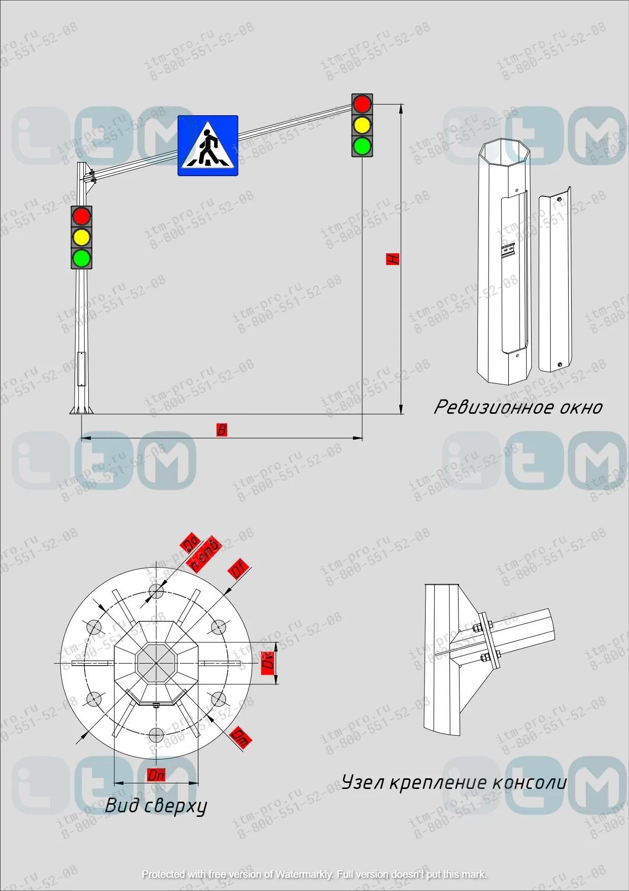 Монтаж светофорных опор ОГСГ производится путем присоединения стойки к закладной детали фундамента при помощи метизов.Закладная деталь фундамента приобретается отдельно. Параметры фундамента рассчитываются в зависимости от конфигурации светофорной опоры и места установки.